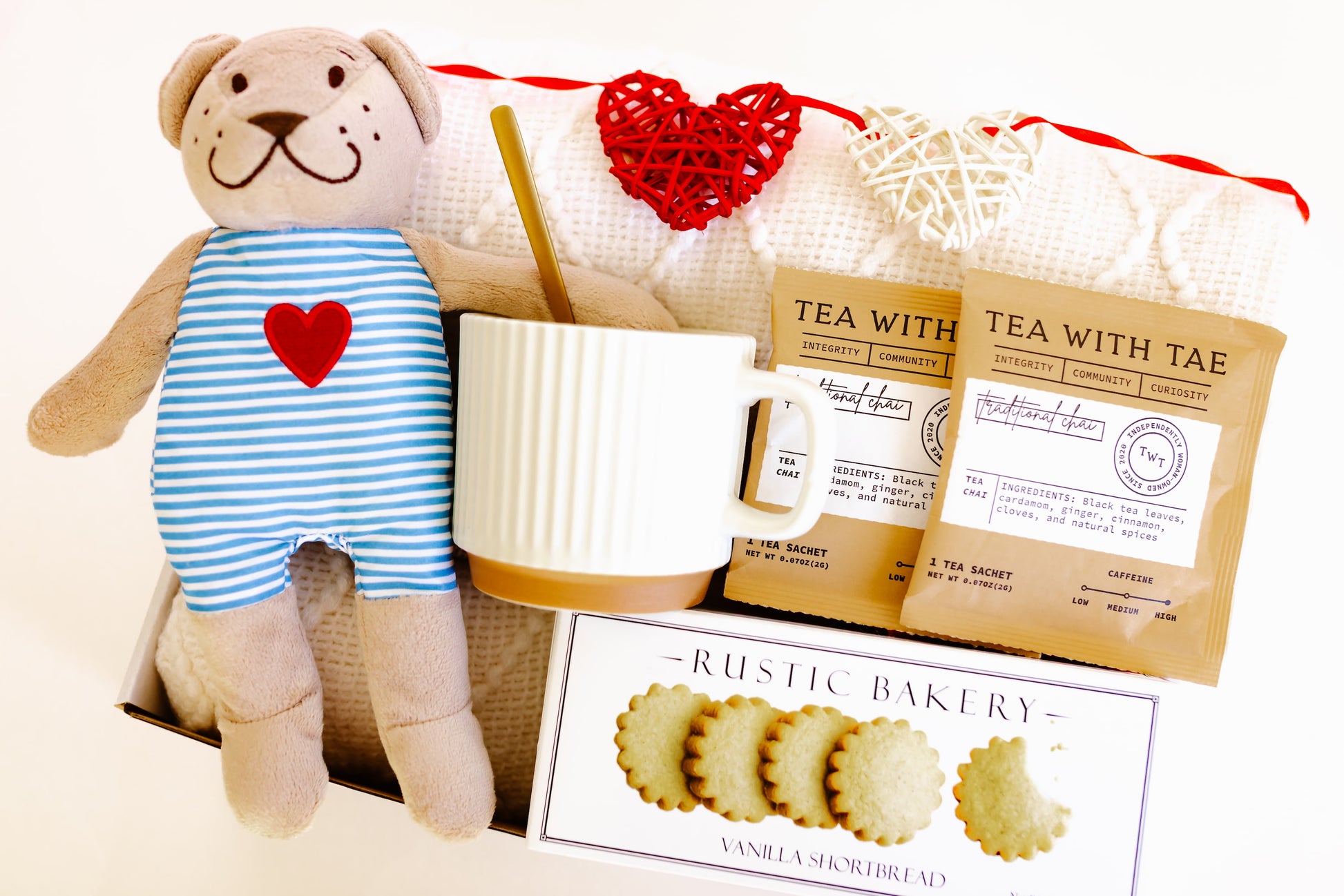 A cozy Valentine’s Day gift box with vanilla shortbread cookies, two chai tea sachets, a ceramic mug with a gold spoon, a soft cozy throw blanket, a teddy bear, and a free personalized greeting card — designed to create a warm, love-filled tea moment for someone special.